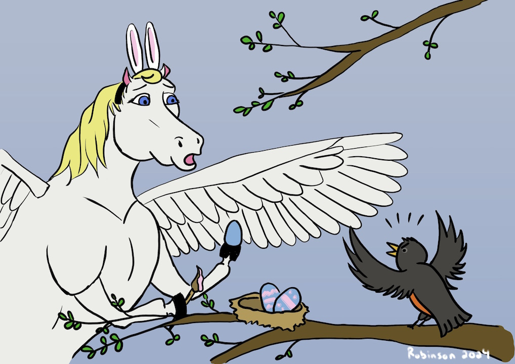 Easter’s still a few weeks away, but I thought I’d include this drawing of Peggy painting eggs, too. Maybe she should have sourced her eggs more responsibly, though!