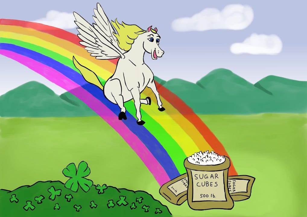 First up is a St. Patrick’s Day-themed scene. Peggy sliding down a rainbow is such a joyous image, right? Of course, the treasure she hopes for isn’t a pot of gold, but bags of sugar cubes!